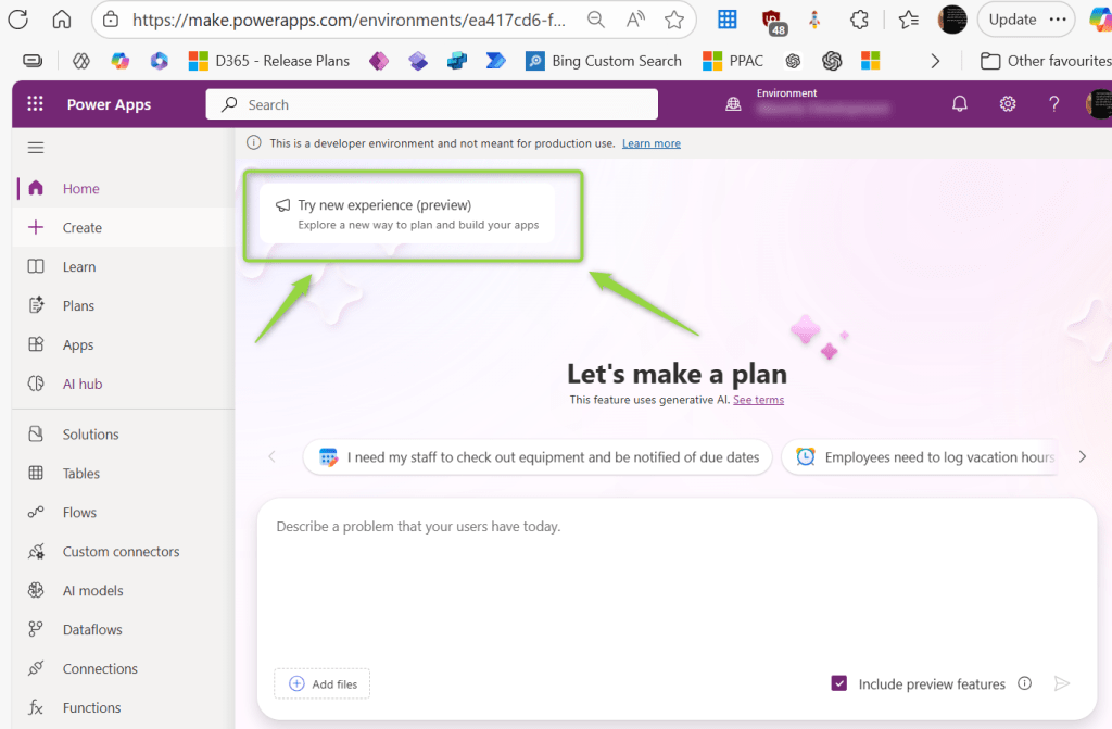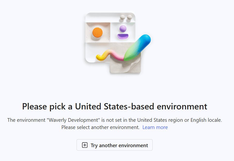 That’s not fair!! Why should us Europeans miss out on the shiny new toy 🤨? A clever way around this restriction is to create a new environment (I chose a developer environment) and select the Region as United States.