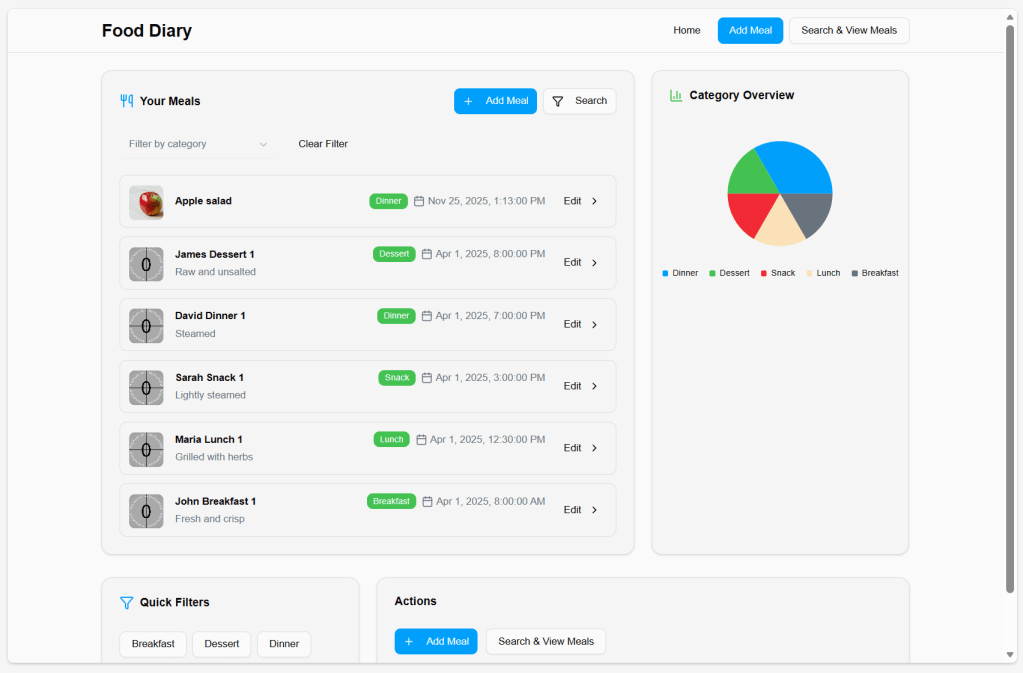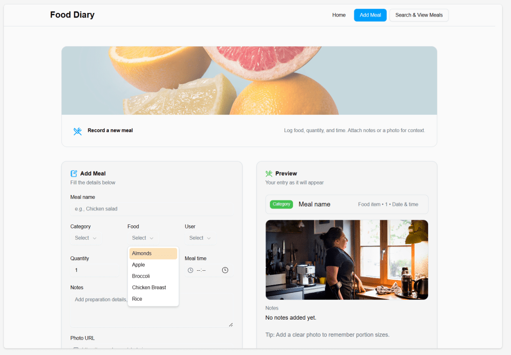When I click ‘Add Meal’ it takes me to an input page where I can fill in details like Meal Name, Category, Food, User etc. It has quite a limited drop down list of Foods, but it’s not bad given the limited information we provided.