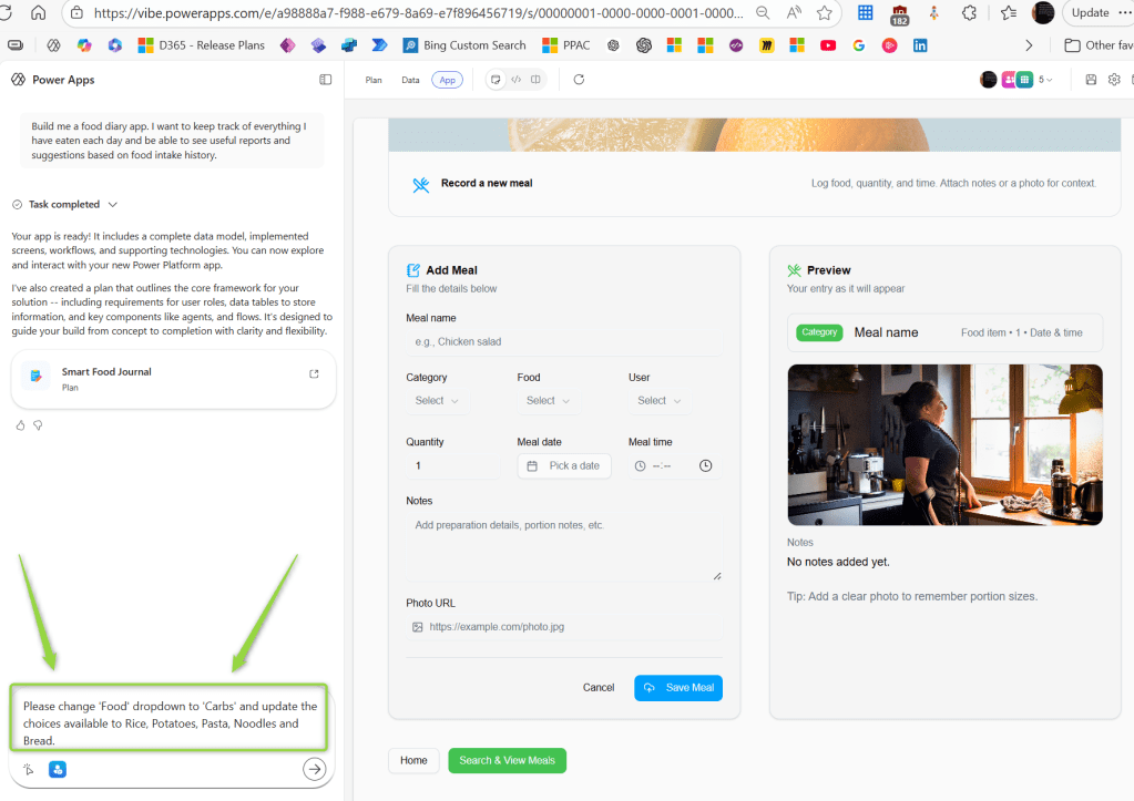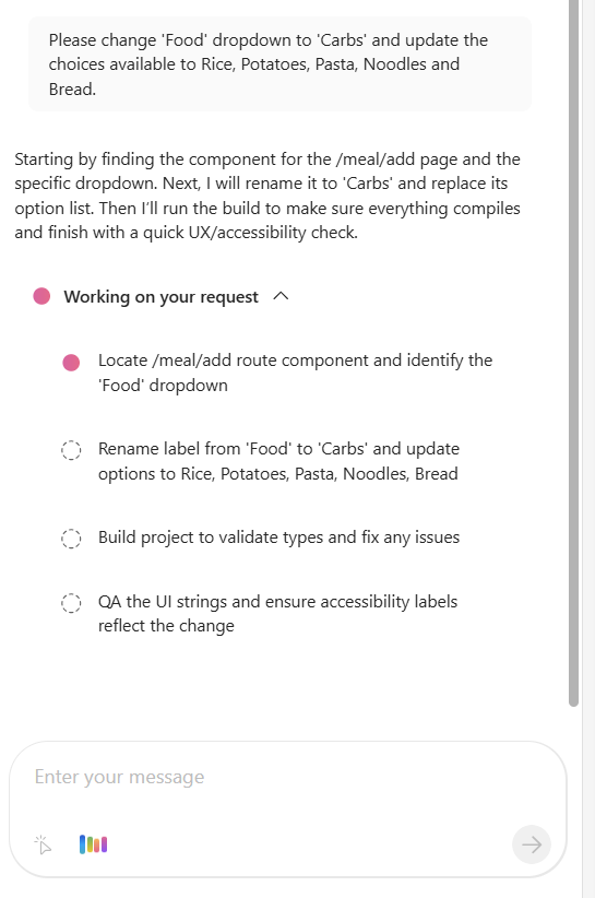 In the left hand side there is a chat pane where we can request changes to the app. Let’s try out the below prompt to switch the list of Foods to a list of Carbs.